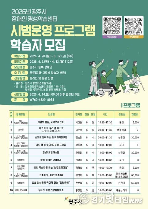 모집 기간은 2일부터 13일까지며 광주시 평생학습포털 ‘어흥’을 통한 온라인 접수 또는 장애인 평생학습센터 방문 접수가 가능하다. 방문 신청 시에는 장애인 복지 카드와 본인 명의 휴대전화를 지참해야 한다.