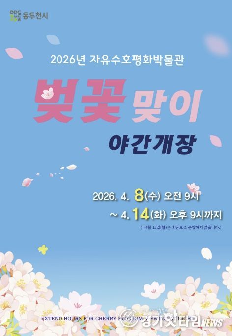 [경기핫타임뉴스=김형철 기자] 동두천시 자유수호평화박물관은 오는 4월 8일부터 14일까지 6일간(4월 13일 월요일 정기 휴관) 벚꽃 개화기를 맞아 자유수호평화박물관 개관 시간을 기존 오후 6시에서 오후 9시까지 연장 운영한다고 밝혔다.