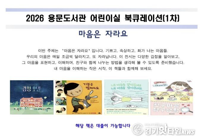 [경기핫타임뉴스=김형철 기자] 양평군은 오는 4월 1일부터 5월 31일까지 용문도서관 어린이자료실에서 ‘마음은 자라요’를 주제로 한 도서 추천 서비스(북 큐레이션)를 운영한다고 밝혔다.