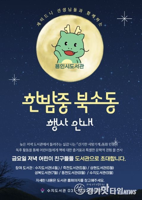 [경기핫타임뉴스=김삼영 기자] 용인특례시 서부도서관은 수지‧죽전‧상현‧성복‧동천도서관에서 야간 독서문화 프로그램 ‘한밤중 북소동’을 운영한다고 25일 밝혔다.