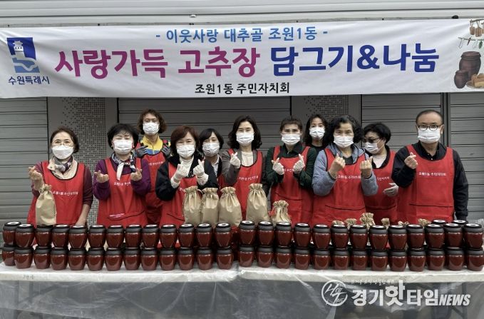 [경기핫타임뉴스=김삼영 기자] 수원시 장안구 조원1동 주민자치회는 지난 1일, 복지행정분과 주관으로 ‘사랑가득 고추장 담그기’ 행사를 열고, 직접 담근 고추장을 관내 취약가구 200여 세대에 전달했다.
