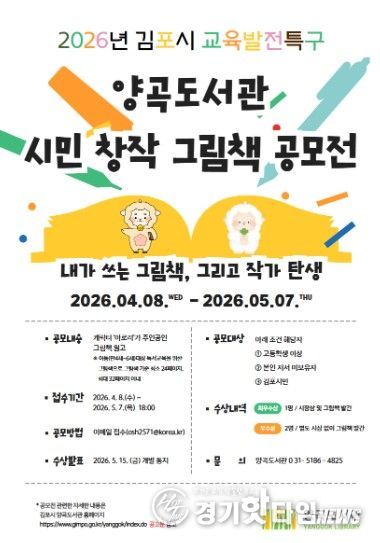 [경기핫타임뉴스=김형철 기자] 김포시 양곡도서관은 2026년 김포시 교육발전특구 사업의 일환으로 시민 작가를 발굴하고 유아 독서교육의 기반을 마련하기 위해 ‘시민 창작 그림책 공모전’을 개최한다.