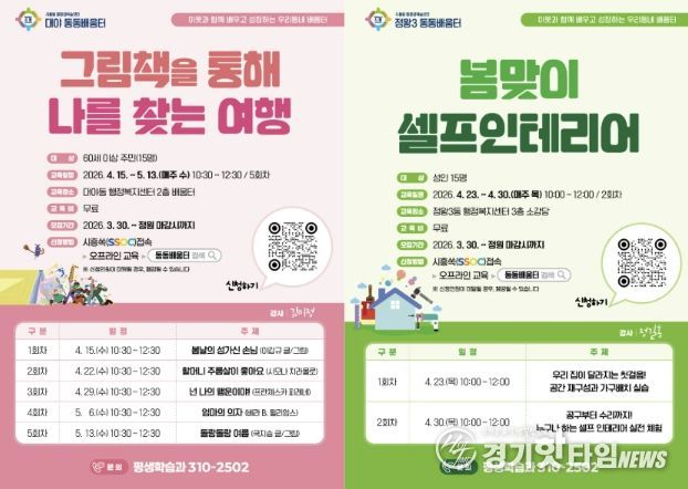 선정된 프로그램은 4월부터 순차적으로 개강해 본격 운영에 들어간다. 주요 강좌로는 대야동에서 ‘그림책을 통해 나를 찾는 여행’, 정왕3동에서 ‘봄맞이 셀프 인테리어’ 등이 진행되며, 동동배움터는 올해 말까지 연중 운영된다.