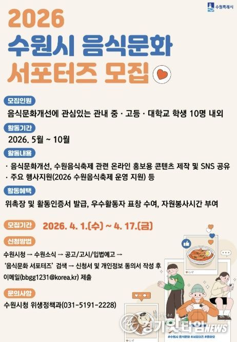 [경기핫타임뉴스=김삼영 기자] 수원특례시는 ‘2026년 음식문화 서포터즈’로 활동할 중·고등·대학생을 4월 17일까지 모집한다.