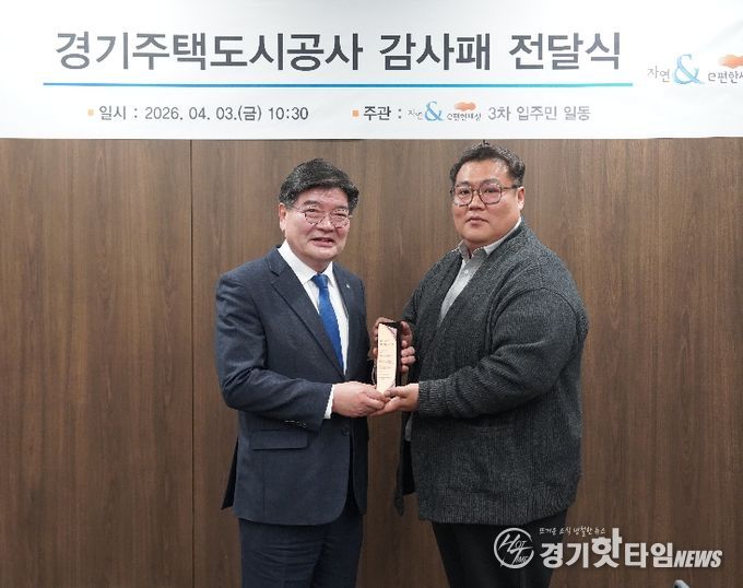 [경기핫타임뉴스=김삼영 기자] 경기주택도시공사(GH)가 수원 본사에서 다산자연앤이편한세상3차 아파트 입주민들로부터 원활한 조기 분양전환 노력과 제도적 지원에 따른 공로를 인정받아 감사패를 받았다고 3일 밝혔다.