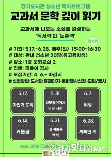 [경기핫타임뉴스=김형철 기자] 김포시 장기도서관은 청소년의 독서력과 논술력 향상을 위해 '교과서 문학 깊이 읽기' 프로그램을 오는 5월 17일부터 6월 28일까지 진행한다.