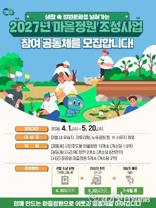 [경기핫타임뉴스=김삼영 기자] 경기도는 마을 내 방치된 유휴 공간을 주민이 직접 정원으로 가꾸는 ‘2027년 마을정원 조성사업’ 대상지를 5월 20일까지 공개 모집한다.