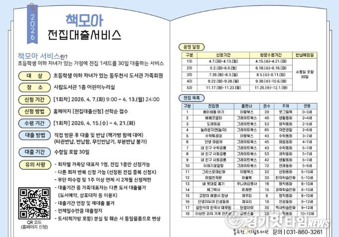 [경기핫타임뉴스=김형철 기자] 동두천시 시립도서관은 2026년 4월부터 12월까지 ‘책모아’ 전집 대출 서비스를 총 5회에 걸쳐 운영한다고 밝혔다.