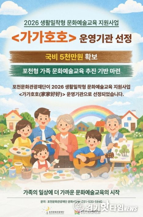 [경기핫타임뉴스=김형철 기자] 포천문화관광재단이 2026 생활밀착형 문화예술교육 지원사업 ‘가가호호(家家好好)’ 운영기관 공모에 최종 선정됐다.