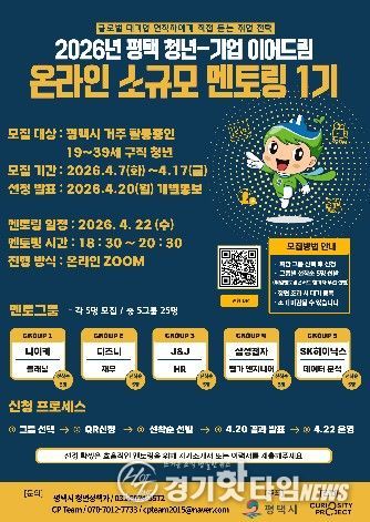 [경기핫타임뉴스=김삼영 기자] 평택시는 기업 현직자들의 취업 멘토링을 통해 실질적인 취업 준비를 지원하고 인적 네트워크 형성 기회를 제공하기 위한 평택 청년-기업 이어드림 ‘온라인 소규모 멘토링 1기’ 참여자를 오는 4월17일까지 모집한다.