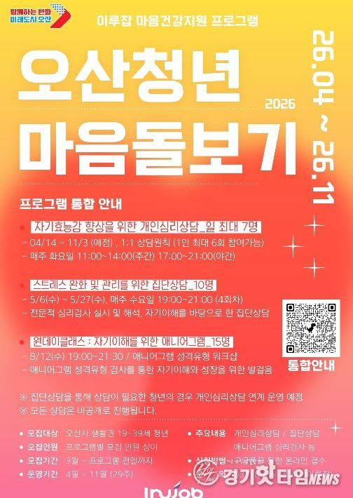 [경기핫타임뉴스=김삼영 기자] 오산시는 청년공간 ‘이루잡’이 지역 청년들의 정신건강 증진을 위해 ‘2026 오산청년 마음돌보기’ 프로그램을 오는 4월 14일부터 11월까지 운영한다고 밝혔다.