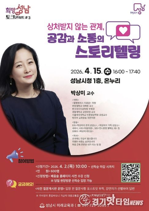 [경기핫타임뉴스=김삼영 기자] 성남시는 오는 4월 15일 오후 4시 시청 1층 온누리에서 ‘상처받지 않는 관계, 공감과 소통의 스토리텔링’을 주제로 한 명사 초빙 강연을 연다.