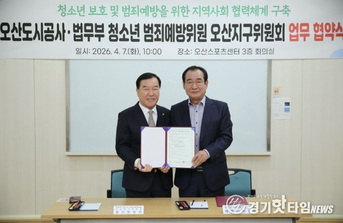 [경기핫타임뉴스=김삼영 기자] 오산도시공사는 지난 7일 법무부 청소년범죄예방위원 오산지구위원회와 함께 오산시 아동·청소년의 사회 안전망 구축과 보호 강화를 위한 업무협약을 체결했다고 밝혔다.