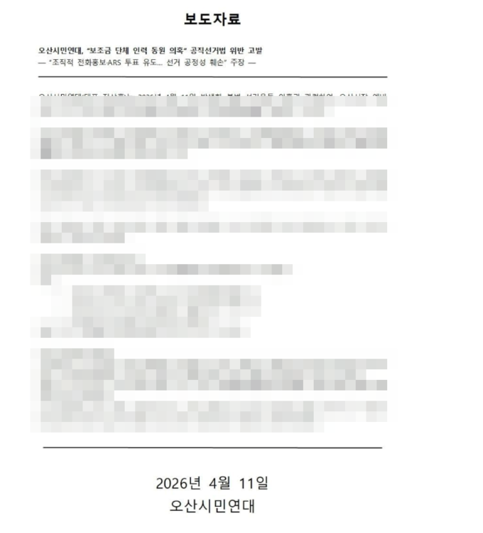 오산시민연대는 11일 보도자료를 통해 “피고발인들은 특정 단체 인력을 활용해 직원 약 7~8명을 동원하고, 특정 후보 지지를 유도하는 전화 홍보와 ARS 투표 참여 권유 활동을 조직적으로 수행했다”고 주장했다.