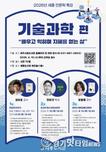 [경기핫타임뉴스=김형철 기자] 여주시는 오는 6월 18일부터 8월 13일까지 세종도서관에서 '2026년 세종 인문학 특강'‘기술과학 편’을 3회 운영한다.