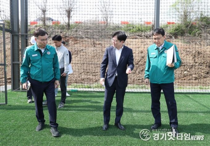 김병수 시장을 비롯해 교육문화국장, 도시주택국장 등이 함께 한 이날 현장 행정에서는 축구장 조성 현황을 확인하고 진입로 설치공사 현장을 직접 점검했다.