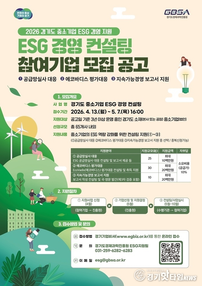 [경기핫타임뉴스=김삼영 기자] 경기도경제과학진흥원(이하 경과원)이 도내 중소기업의 지속 가능한 경영 기반을 강화하고 급변하는 글로벌 규제에 선제 대응하기 위해 ‘경기도 중소기업 ESG 경영 컨설팅 지원사업’ 참여 기업을 다음달 7일까지 모집한다고 밝혔다.