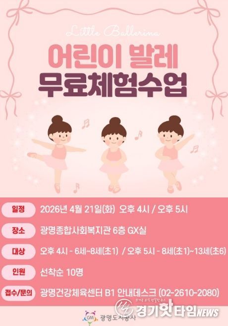 운영 프로그램은 K-POP 댄스와 어린이 발레 2개 종목으로 구성된다. 상세 일정은 ▲어린이 발레 4월 21일 ▲K-POP 댄스 4월 22일이며, 광명종합사회복지관 6층 GX실에서 진행될 예정이다.