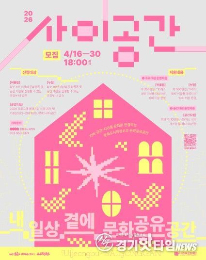 [경기핫타임뉴스=김형철 기자] 의정부문화재단이 문화도시조성사업의 주요 과제인 ‘15분 문화생활권’ 조성을 위해 2026 문화 공유공간 지원사업 '사이공간' 참여 공간을 오는 4월 30일 18시까지 모집한다.