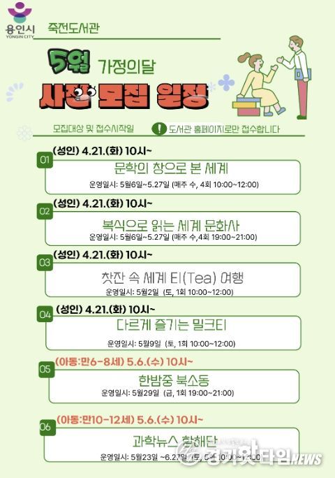 [경기핫타임뉴스=김삼영 기자] 용인특례시 죽전도서관은 오는 5월 가정의 달을 맞아 ‘2026년 5월 독서문화행사’를 개최한다.