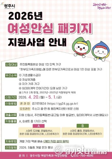 [경기핫타임뉴스=김삼영 기자] 광주시는 여성 1인 가구와 한부모가족의 생활 안전 강화를 위해 ‘여성 안심 종합 지원사업’ 대상자 35가구를 오는 20일부터 5월 1일까지 모집한다고 17일 밝혔다.