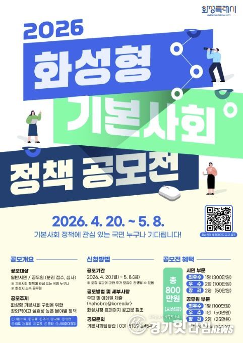[경기핫타임뉴스=김삼영 기자] 화성특례시는 시민 참여 기반을 확대하고, 실효성 있는 기본사회 정책을 발굴하기 위해 '2026년 화성형 기본사회 정책 공모전'을 개최한다고 밝혔다.