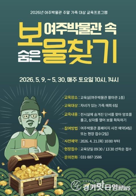 [경기핫타임뉴스=김형철 기자] 여주시 여주박물관은 가정의 달 5월을 맞아 가족이 함께 지역 문화유산의 가치를 즐겁게 배우고 체험할 수 있는 ‘여주박물관 속 숨은 보물찾기’를 운영한다.