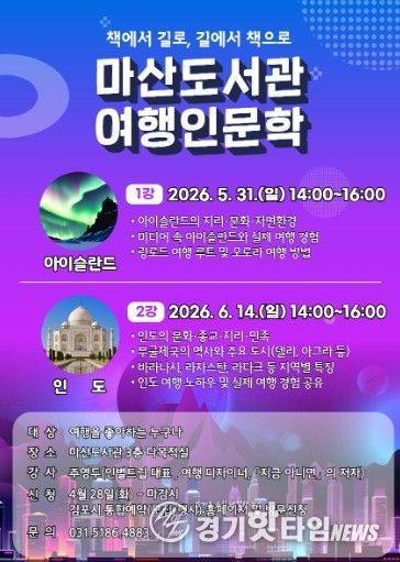 [경기핫타임뉴스=김형철 기자] 김포시 마산도서관이 오는 5월 31일과 6월 14일 오후 2시부터 4시까지 다목적실에서 여행 인문학 강연 ‘책에서 길로, 길에서 책으로’를 운영한다.