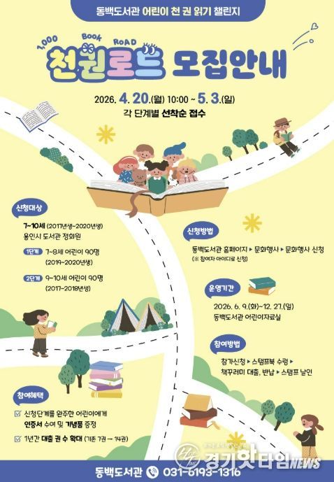 [경기핫타임뉴스=김삼영 기자] 용인특례시 동백도서관은 어린이 천 권 읽기 챌린지 ‘천권로드(ROAD)’ 참여자를 모집한다고 20일 밝혔다.