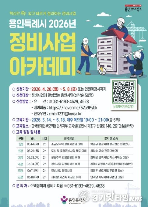 [경기핫타임뉴스=김삼영 기자] 용인특례시는 4월 20일부터 5월 8일까지 ‘2026년 정비사업 아카데미’ 수강생을 모집한다.