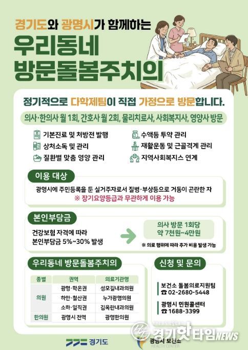 [경기핫타임뉴스=김삼영 기자] 장기요양등급이 없는 광명시민도 집에서 방문돌봄주치의 진료를 받을 수 있게 된다.