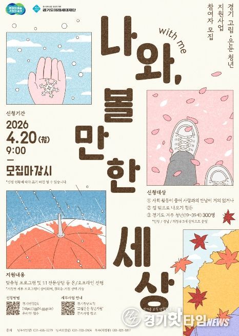 [경기핫타임뉴스=김삼영 기자] 경기도가 사회적 관계가 단절된 고립·은둔 청년의 일상 회복을 돕기 위해 20일부터 ‘경기 고립·은둔 청년 지원사업: 나와(with me), 볼만한 세상’ 참여자 300명을 모집한다.
