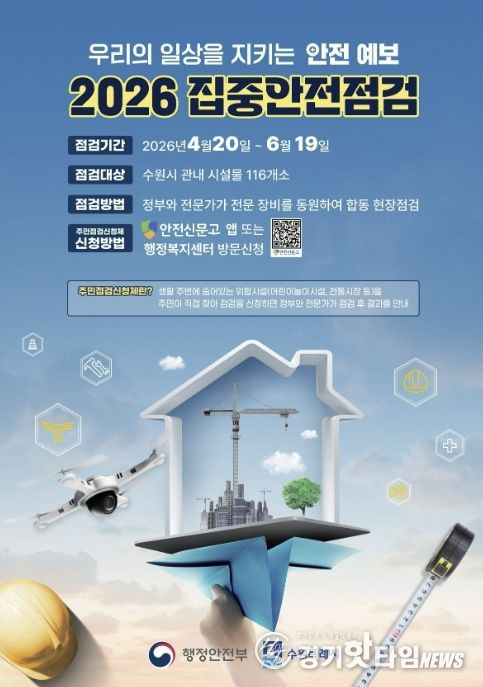[경기핫타임뉴스=김삼영 기자] 수원특례시가 안전사고를 예방하고, 시민의 안전 의식을 고취하기 위해 20일부터 6월 19일까지 ‘2026년 집중안전점검’을 한다.