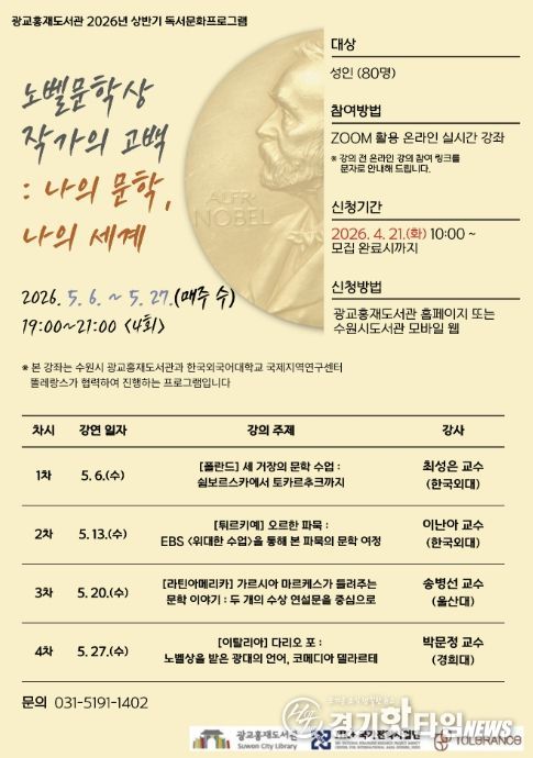 [경기핫타임뉴스=김삼영 기자] 수원시 광교홍재도서관이 한국외국어대학교와 협력해 진행하는 2026년 세계문화기행 시리즈 1편 ‘노벨문학상 작가의 고백 : 나의 문학, 나의 세계’ 강좌를 수강할 시민을 모집한다.