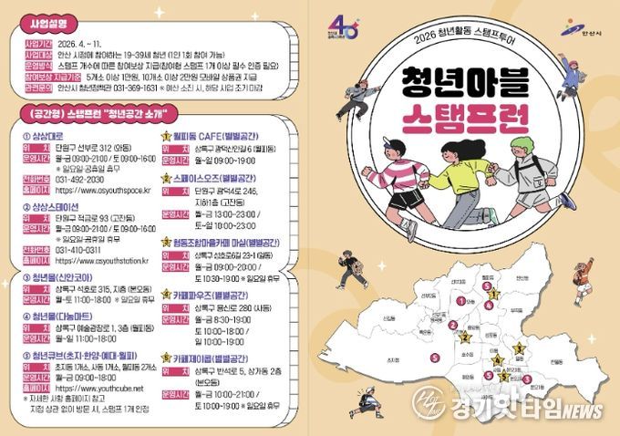 [경기핫타임뉴스=김삼영 기자] 안산시는 청년의 시정 참여를 확대하고 청년공간과 정책에 대한 접근성을 높이기 위해 청년활동 스탬프투어 ‘청년마블 스탬프런’ 사업을 운영한다고 20일 밝혔다.