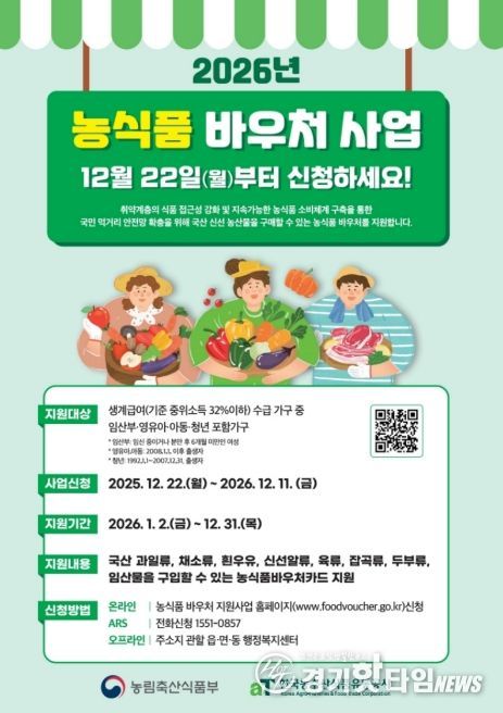 [경기핫타임뉴스=김형철 기자] 파주시는 취약계층의 균형 잡힌 식생활을 지원하고 국산 농식품 소비를 촉진하기 위해 '2026년 바우처 지원사업’을 확대 시행한다.