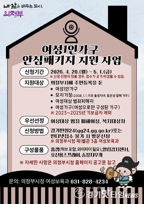 [경기핫타임뉴스=김형철 기자] 의정부시는 4월 20일부터 5월 1일까지 12일간 온․오프라인을 통해 여성 1인 가구 안심패키지 지원사업의 신청을 접수한다.