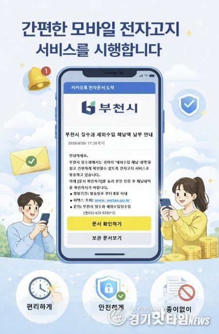 [경기핫타임뉴스=김형철 기자] 부천시는 이달 20일부터 시민 납세 편의를 높이고 고지서 전달의 정확성을 강화하기 위해 세외수입(일반회계) 체납안내문을 카카오톡으로 발송하는 모바일 전자고지 서비스를 시행한다.