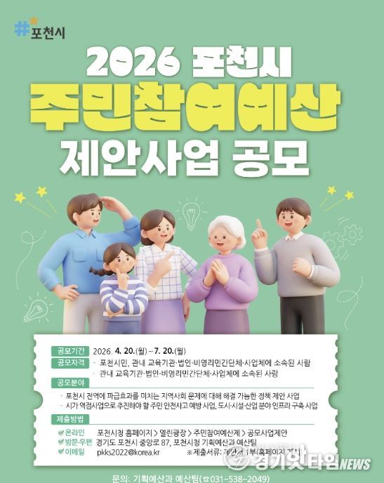 [경기핫타임뉴스=김형철 기자] 포천시가 4월 20일부터 오는 7월 20일까지 2027년도 예산편성을 위한 주민참여예산 공모제안사업을 접수하고 있다.