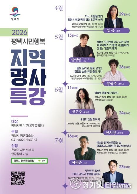 한편 모든 강좌는 4월 20일부터 평택시 평생학습 포털 및 전화로 사전 신청할 수 있으며, 일부 잔여 좌석에 한해 현장 참여도 가능하다. 평택시는 이번 지역 명사 특강을 통해 시민의 지식 성장을 지원하고, 열린 평생학습 문화 조성을 더욱 강화할 계획이다.