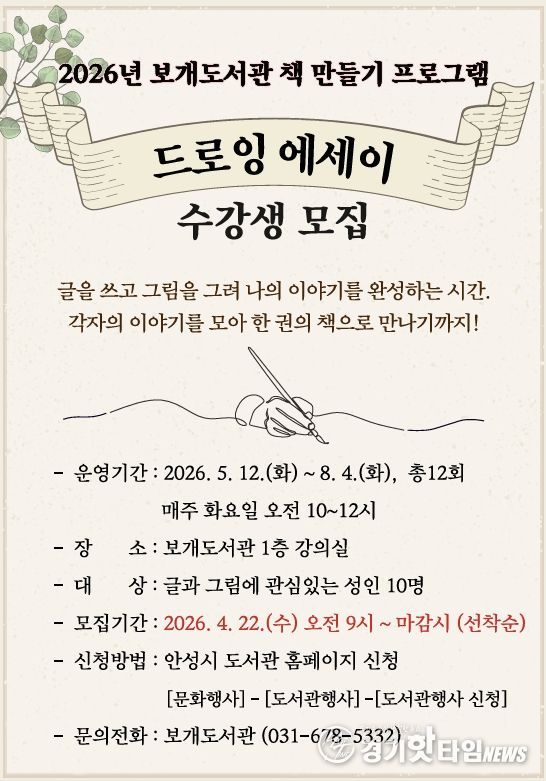 [경기핫타임뉴스=김삼영 기자] 안성시 보개도서관(책문화센터)이 시민들의 창작 활동을 지원하고 일상 속 예술 경험을 확대하기 위해 오는 5월부터 ‘드로잉 에세이’와 ‘포토 에세이’ 책 만들기 프로그램을 새롭게 운영한다고 밝혔다.