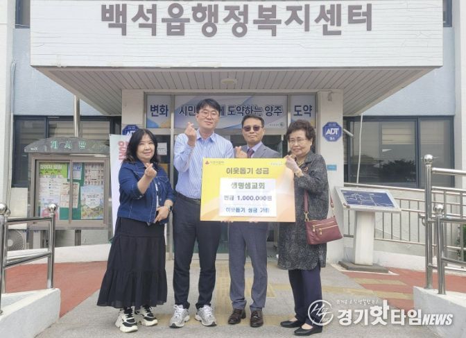 [경기핫타임뉴스=김형철 기자] 양주시 백석읍은 지난 17일 생명샘교회가 지역 내 어려운 이웃을 돕기 위한 성금 100만 원을 기탁했다고 밝혔다.