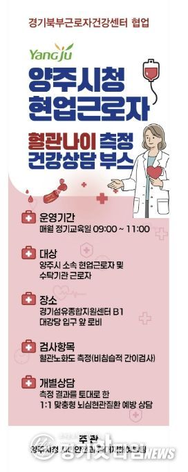 [경기핫타임뉴스=김형철 기자] 양주시가 현업근로자의 건강 증진과 뇌심혈관계질환 예방을 위해 오는 4월 22일부터 연말까지 ‘찾아가는 근로자 건강상담 부스’를 운영한다.