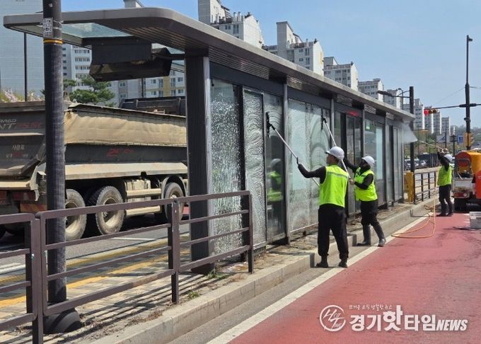 이번 정비는 ‘2026 고양국제꽃박람회’를 앞두고 시민과 방문객에게 쾌적한 대중교통 이용 환경을 제공하기 위해 추진됐다. 승강장 상단부와 벤치, 바닥면을 포함해 매연과 불법 광고물로 오염된 유리 벽면까지 고압 세척기를 활용해 내·외부 전반의 오염물질을 제거했다.