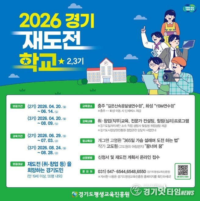 [경기핫타임뉴스=김삼영 기자] 경기도와 경기도평생교육진흥원은 취업이나 창업 실패를 경험한 도민의 재기를 지원하기 위해 오는 20일부터 ‘2026년 경기 재도전학교’ 2~3기 참가자를 각각 55명 내외로 모집한다.