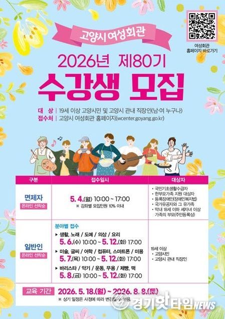 [경기핫타임뉴스=김형철 기자] 고양특례시 여성회관은 오는 5월 4일부터 12일까지 2026년 제80기 정규강좌 수강생을 모집한다.