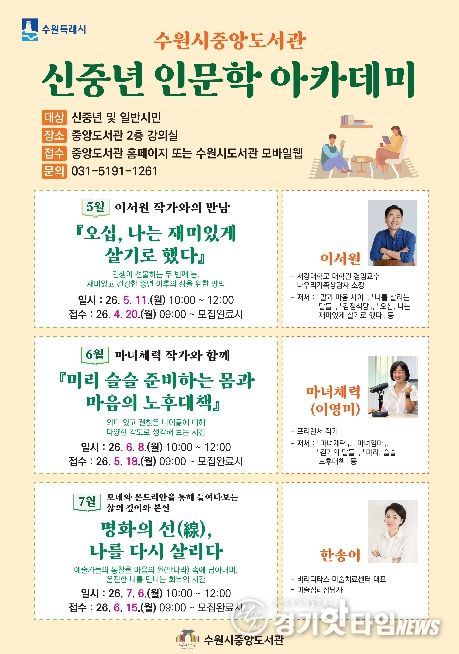 [경기핫타임뉴스=김삼영 기자] 수원시 중앙도서관이 5월부터 7월까지 매달 1회 운영하는 ‘신중년 인문학 아카데미’ 수강생을 모집한다.
