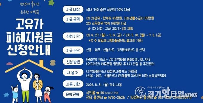 [경기핫타임뉴스=김형철 기자] 의정부시는 중동전쟁으로 촉발된 고유가‧고물가로 인한 국민 부담을 경감하고자 ‘고유가 피해지원금’ 신청을 4월 27일부터 접수한다.
