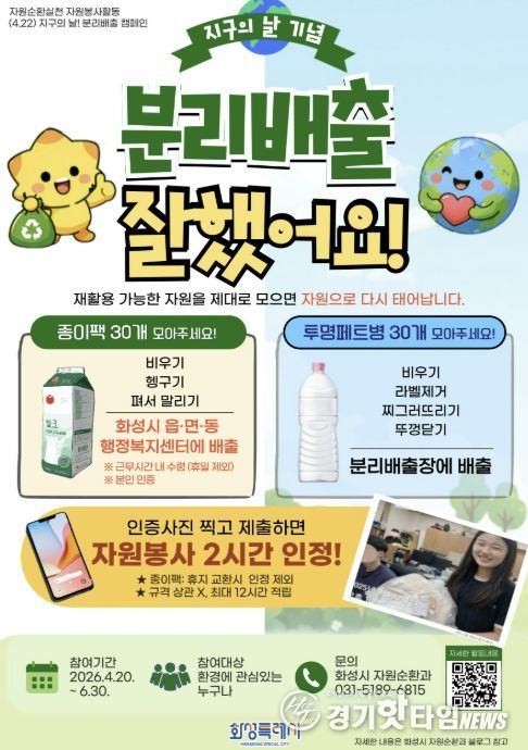 [경기핫타임뉴스=김삼영 기자] 화성특례시가 2026년 ‘지구의 날(4월 22일)’을 맞아 시민들이 일상 속에서 환경 보호를 실천할 수 있는 자원봉사 활동 '분리배출 잘했어요' 캠페인을 운영한다고 밝혔다.