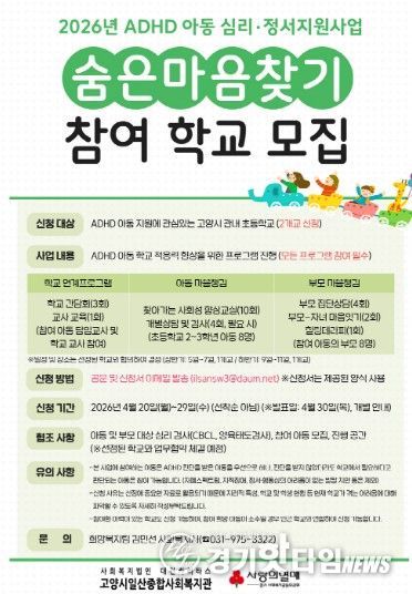 [경기핫타임뉴스=김형철 기자] 고양시일산종합사회복지관은 ADHD 아동의 학교 적응을 돕기 위한 심리·정서지원사업 ‘숨은마음찾기’에 참여할 학교를 모집한다고 21일 밝혔다.